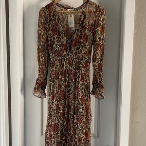 Sundance Litzy Bloom Dress Floral Ruffle Long Sleeve Boho Midi Sheer PL