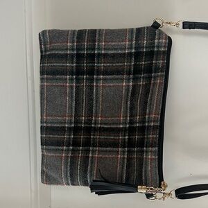 Stylish plaid crossbody bag in black and gray. Perfect for everyday use with a chic fall plaid. Strap can be removed to use as a clutch.