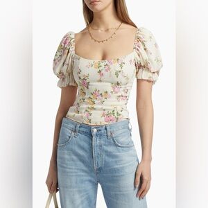The Marin top from Reformation is adorned with a charming floral motif. Short puff sleeves lend added shape to this fitted style.