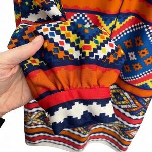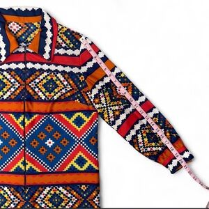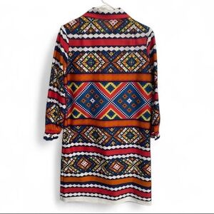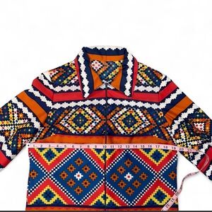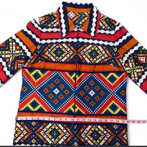 70s Aztec Print Button Up Shirt Dress in vibrant colors! The metal zipper (how you can tell this is late 60's early 70's) only goes down to waist. Unlined and no tags. A lot of dresses were homemade by using patterns! Most likely a polyester. Measurements in photos, measures like a size medium.