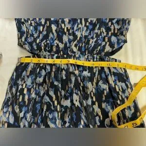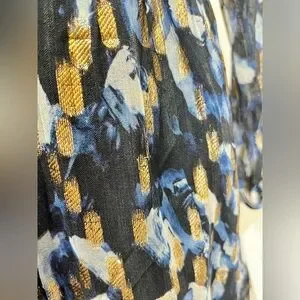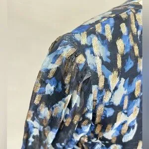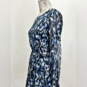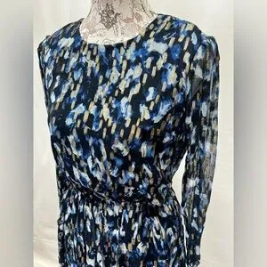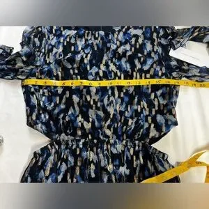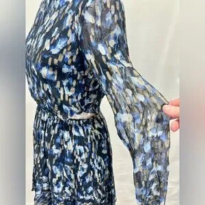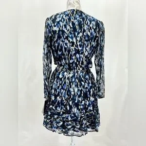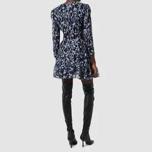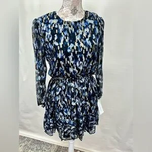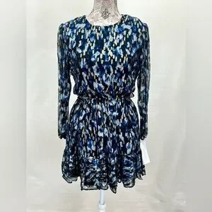 Navy blue and gold cutout waist mini dress from FRENCH CONNECTION, size 8. Dress has round neckline, long sheer sleeves and tiered skirt.