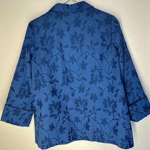 Chic blue blazer with floral pattern. Stylish button closure. Ideal for versatile wear.