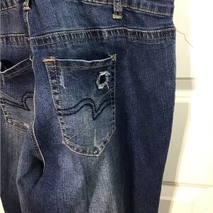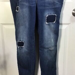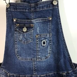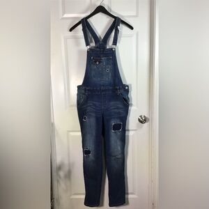 Stylish denim overalls. Features adjustable straps. Distressed details on legs. Front pocket design.