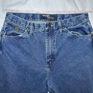 Wrangler Jeans Mens 33x34 Blue George Strait Cowboy Cut Western Rancher in good pre-owned condition with visible wear at the bottom hems. Both inner leg hems have small tears/fraying with some loose threads/unraveling near the inseam. Please see photos for details and measurements.