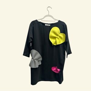 Elegant black dress by Bahnhof featuring a striking attached floral designs in fuchsia, yellow and striped. Perfect for making a statement at work or at a nice dinner out. It’s probably made in Korea and has a nice quality feel to it.