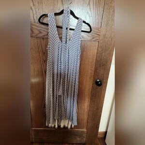Latched Mama Romper in blue and white polka dots pattern with coordinating belt. Side nursing access.