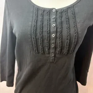 Stylish black top with button-down front. Features delicate ruffling accents. Ideal for any occasion.