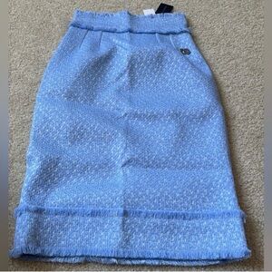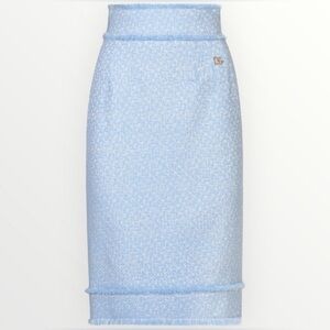 Authentic Dolce & Gabbana calf-length tweed pencil skirt in a beautiful soft blue raschel weave, finished with subtle frayed detailing and the iconic DG logo accent. A timeless, polished piece that transitions effortlessly from office to evening.