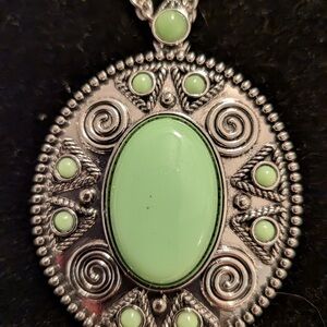 Stylish silver necklace with bold green stones. Perfect for any occasion.