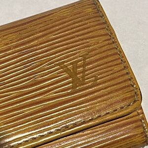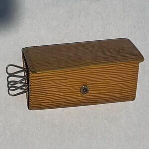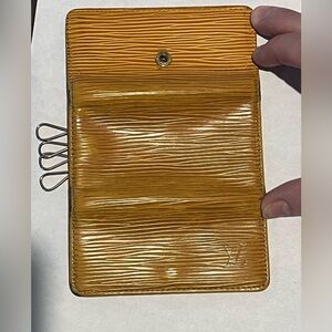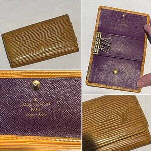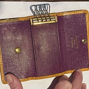 Elegant key case with purple interior and yellow gold epi leather with embossed LV. Features textured design and branded detail.