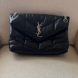 Elegant black quilted design. Features iconic YSL logo. Silver chain strap for a sophisticated touch.