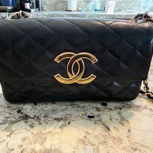 Chic CHANEL crossbody bag in black quilted design. Features iconic gold chain strap and logo. Perfect for stylish outings.