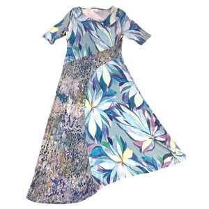 Soft Surroundings maxi dress showcases a vibrant mixed print design with bold floral and abstract patterns in shades of blue, green, and pink. Crafted from a comfortable rayon-spandex jersey knit, this short-sleeve piece features a flattering scoop neckline and an asymmetrical panel construction that adds a unique architectural element to the silhouette. The lightweight, breathable fabric offers a gentle stretch, making it an ideal choice for garden parties, vacations, or elevated everyday wear.