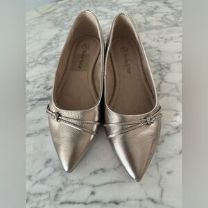 Bella Vita Rhea Pointed Toe Flats. These elegant ballet flats feature a sleek, contemporary pointed toe and a unique knotted vamp detail with strappy accents.
