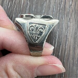 • Silver-tone ring with fleur-de-lis shield detail on the sides