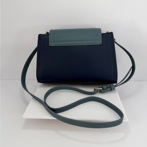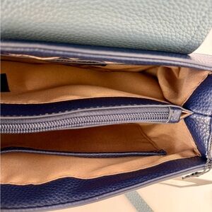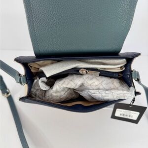 Brand New! This handbag is the Tahari Robbie Triple Compartment crossbody in the "Mist Block" colorway.