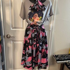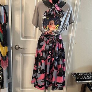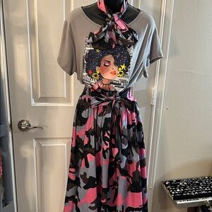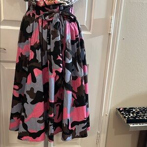 Stand out with this stylish camouflage skirt featuring vibrant pink, gray and classic black tones. This skirt will fit Size Small through 1X only. The skirt is 28 Inches long. This is a mid length skirt. Perfect for any casual outing. Only the skirt is included in this sale. However if you like the top I can list it! All Sales are Final!