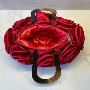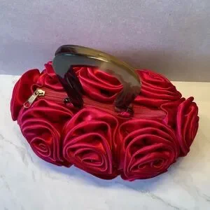 Beautiful hot pink or fuschia evening bag adorned with satin rosettes that creates a lush, textured floral appearance. It has a zipper closure and tortoiseshell Bakelite like handles. The interior is also lined in satin. Very nice condition and perfect for your special occasion.