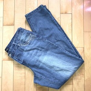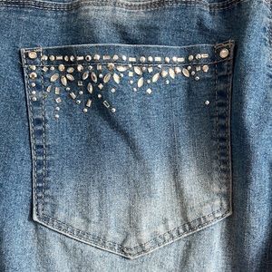 DESCRIPTION: bedazzled jeans with jewels and rhinestones on the back pocket and around the front pocket. Y2K vintage style. Slim Straight leg.