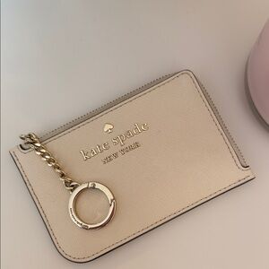 Chic Kate Spade card holder in beige. Features a stylish gold chain. Perfect for organizing essentials.
