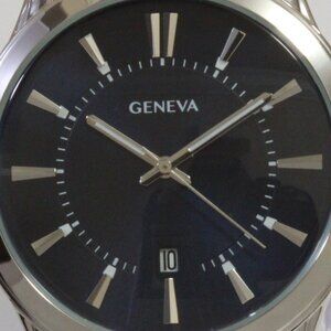 Men's quartz dress watch by Geneva featuring a Navy blue dial with raised indices and date complication in a silver tone case. It's held in place by a brown simulated crocodile strap. This watch is new in box and works as it should.