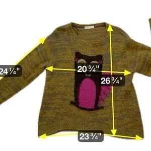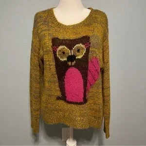 Charming owl design on a cozy sweater. Mustard and pink hues for a playful look.
