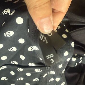 Stylish black swim top with white polka dots. Features a flattering ruched design. Perfect for a chic beach look.