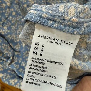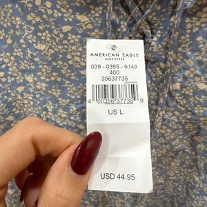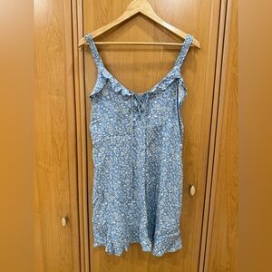 Charming blue floral dress. Features ruffled neckline. Sleeveless with adjustable straps. Perfect for casual outings.