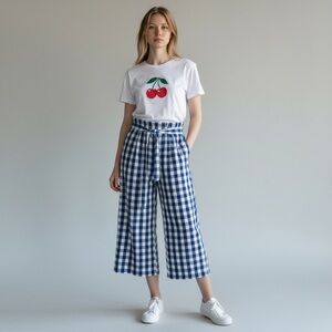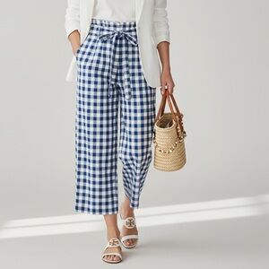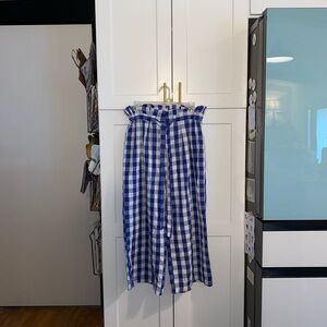 Joie Gingham Blue White Paperbag waist tie belt Wide leg Cropped Pants Spring