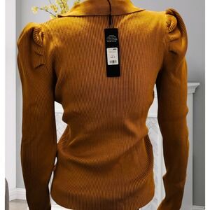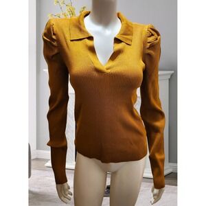 Fashion Nova Central Park Puff Sleeve Sweater Mustard Yellow Ribbed Knit 1X NEW