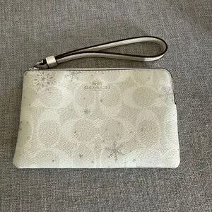 Chic Coach wristlet with snowflake design. Cream color adds elegance. Ideal for versatile use.