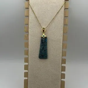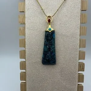 Beautiful dyed blue agate pendant on gold stainless steel ball chain. Bail is a gold color with two stones. The red stone is Nahong agate and I believe the other stone is dyed howlite to resemble turquoise. It could be natural turquoise but I’m not 100% sure. The chain length is approx 20” long with 2” extender chain and lobster clasp. Pendant drop is about 2”.