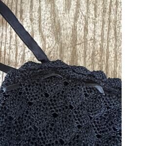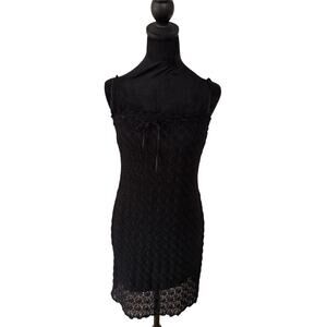 Vintage-inspired black crochet lace slip dress by Laundry by Shelli Segal, size L (Petites line). Made in the USA, this fitted spaghetti strap dress features intricate allover crochet, scalloped hem, and delicate front tie detail at the bust—very 90s minimalist meets modern mob-wife edge.