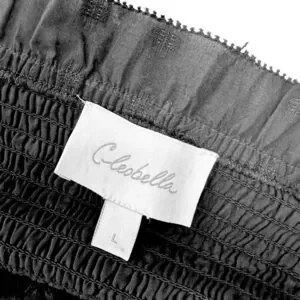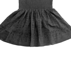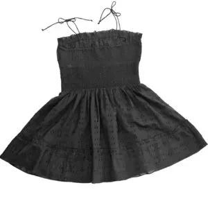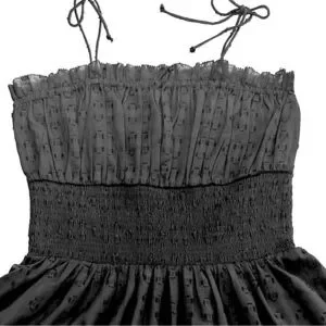 Cleobella for Anthropologie shoulder-tie sun mini dress, black. Gathered, smocked elastic waist and back, shoulder ties. Ruffle trim and hem. A perfect summer casual dress that can be dressed up or down; can also be worn over a swimsuit as a beach/pool cover-up. Textured, almost eyelet-like 80% cotton, 20% poly blend. Fully lined (100% cotton). Excellent used condition: no stains, holes, or pills.