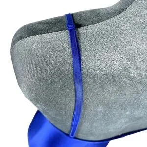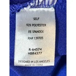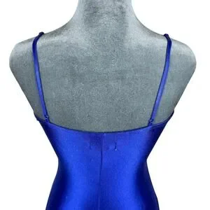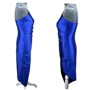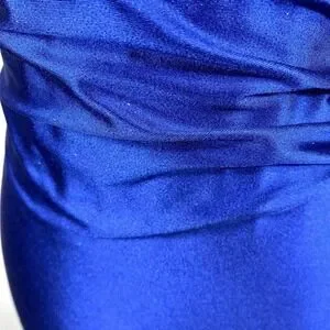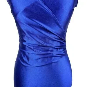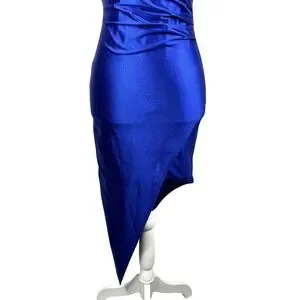 Cobalt blue fabric with sparkles/glitter. Sleeveless. Faux wrap bodice. Ruched waist. Asymmetric hem. Bodycon. Stretchy. Adjustable straps.