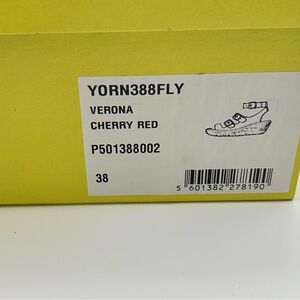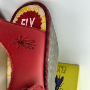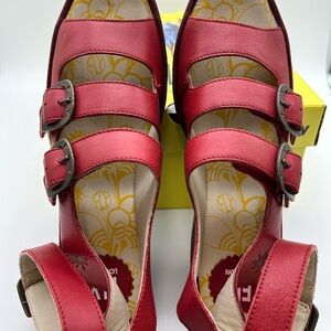 Chic red sandals with triple straps. Cushioned wedge for comfort.