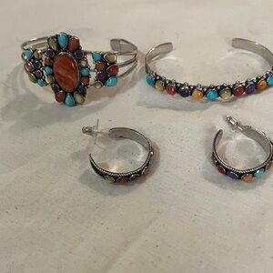 925 silver from the Philippines, Native American stones, two bracelets and a pair of earrings. This jewelry is an exceptionally beautiful. you get all three pieces for one money.