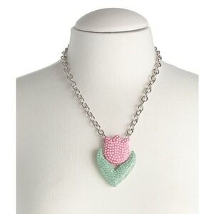 Betsey Johnson Pink Tulip Crystal Pendant Necklace Silver Plated Spring