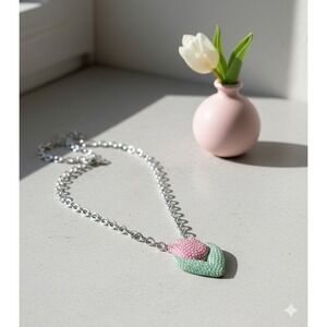 This eye-catching statement piece features a pink crystal tulip layered over mint green leaves on a chunky silver-plated chain. The pendant is fully embellished with crystal stones for maximum shine and signature Betsey whimsy.