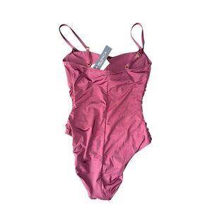 Brand new with tags. Hygiene sticker is on gusset. This one piece features shirred side seams, removable cups, and adjustable straps.