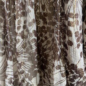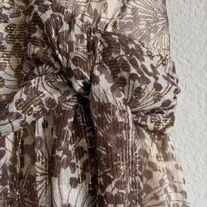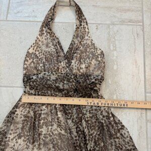 The BCBG MAXAZRIA Silk Babydoll Gold Halter Dress is a stylish and elegant choice for various occasions such as weddings, parties, or formal events. This knee-length dress features a flattering fit and flare silhouette with a luxurious silk fabric and metallic accents, adding a touch of glamour. There is a tie on the side to cinch the empire waist as desired. The halter hook and eye closure with a Marilyn Monroe inspired silhouette make it perfect for all seasons, while the floral pattern and sheer detailing add a touch of sophistication to the overall look. Made by the reputable brand BCBGMAXAZRIA, this dress is sure to make a statement and turn heads wherever you go.