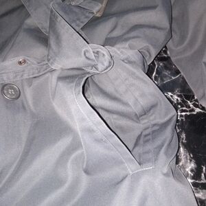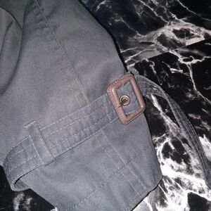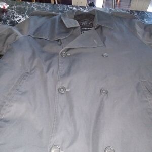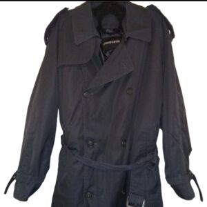 Very nice, gently worn black double breasted trench coat with a removeable liner, slip pockets, button closures and strap details size 40L
