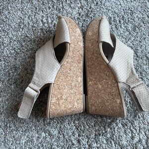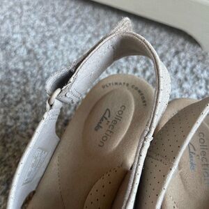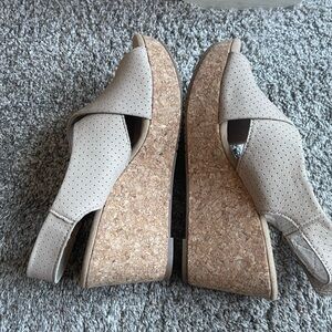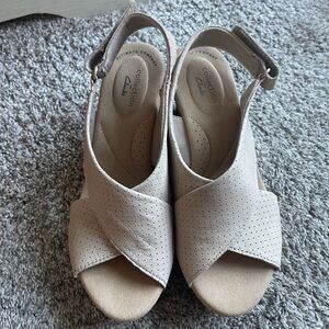 New, never worn outside, only tried on, collection by Clarks, model Annadel Parker, color sand suede, 100% premium suede upper with a cork-wrapped wedge platform, features cushion soft technology, heel height approximately 3 inches. Size 7.5. Adjustable Velcro strap on the back. Smoke free home.