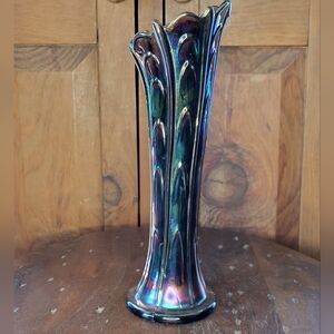 Antique Fenton iridescent carnival glass vase, featuring an amethyst color and a flute or "swung" shape. No chips or cracks and is in Super Excellent Original Condition. $80.