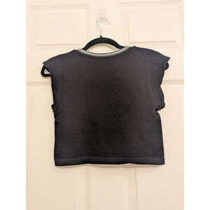 This is a women's black ribbed crop top from Urban Outfitters that was popular and sold out, size XL. It features a deep V-neckline with a gray trim and decorative stitching that mimics a button-up placket. The top has short, cap-style sleeves and a fitted silhouette. The fabric appears to be a stretchy, ribbed knit. The back is plain black with the same ribbed texture. No significant imperfections are visible.