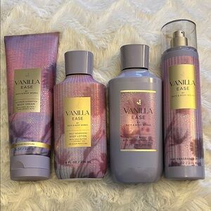 Experience the Vanilla Ease set. Includes $18.95 body cream, $16.95 body lotion, $16.95 body wash, and $18.95 fragrance mist. Perfect for pampering. $72 retail for all four products! Brand new, unopened and unused.