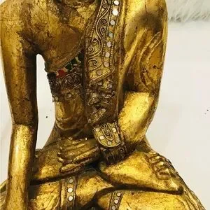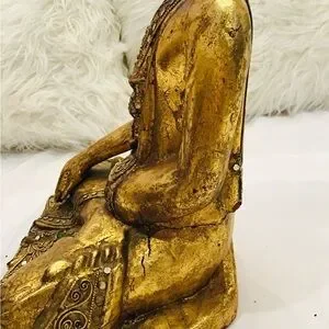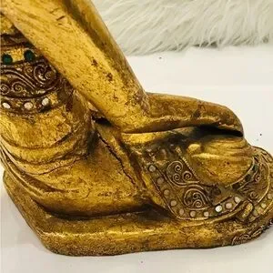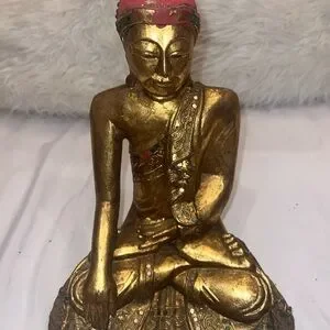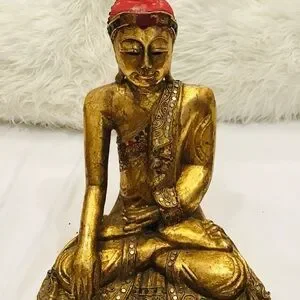 Elegant gold Buddha statue with red accents. Perfect for home decor.