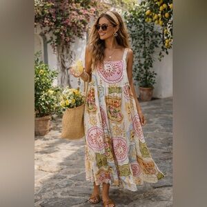 Paper Heart Soleil Print Maxi Dress L Boho Euro Summer Italy Vibes