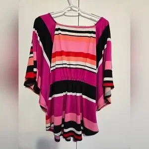 Vibrant women's top featuring bold pink and black stripes. Perfect for adding a pop of color to your wardrobe.