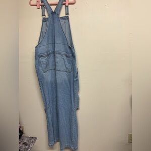 Casual light blue denim overalls. Features adjustable straps and a front pocket.